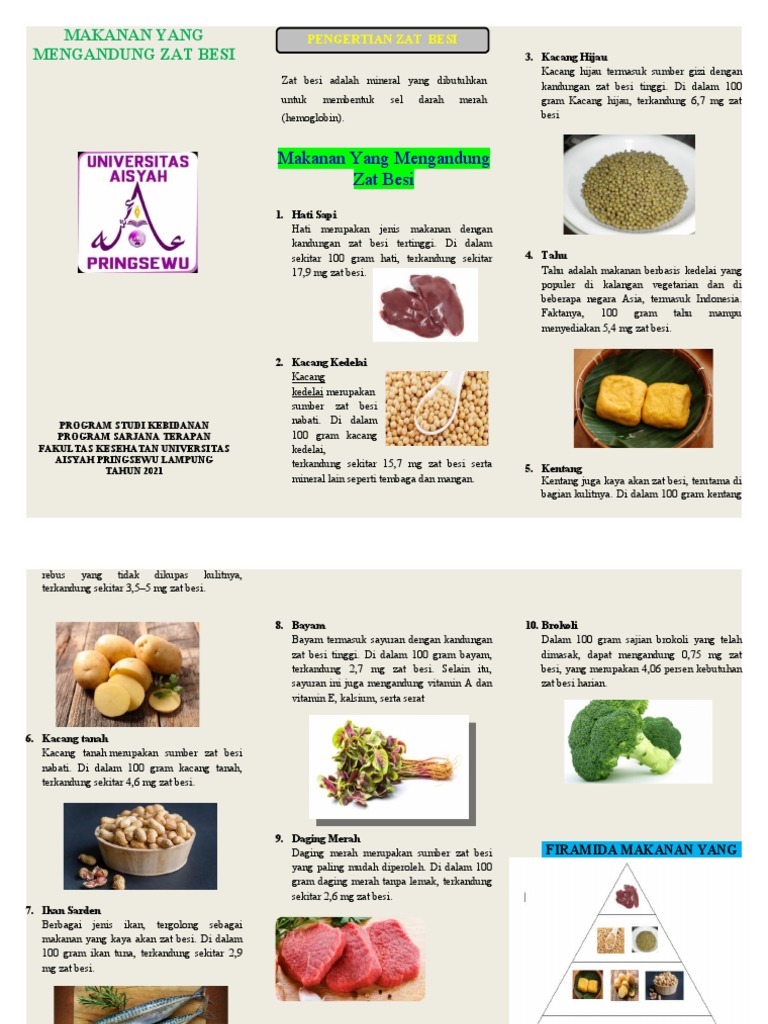 Kedelai (6,5 mg /75 gram) kedelai adalah salah satu bahan makanan yang sering kita temukan dalam makanan olahan. 100 gram sayuran berdaun gelap ini mengandung lebih dari 2 mg zat besi, juga vitamin a dan e, protein, kalsium, dan serat. Setelah makan makanan sumber zat besi, sertakan dengan makanan yang mengandung vitamin c agar lebih mudah diserap oleh tubuh. Kangkung mengandung jumlah tinggi zat besi, kalsium, dan kalium. Raspberry selain rasanya lezat dan berkhasiat tinggi untuk kesehatan, masih jarang yang tahu bahwa raspberry juga termasuk dalam daftar buah yang mengandung zat besi. Beberapa jenis jamur ternyata mengandung banyak zat besi. Jadi banyak sekali sayuran yang mengandung zat besi yang bisa anda konsumsi. Daging juga kaya protein, seng, selenium, dan beberapa vitamin b. Setiap 100 gram bayam mengandung 2.71 miligram zat besi. Beberapa jenis jamur seperti jamur putih yang umum dijadikan menu makanan menurut penelitian mengandung setidaknya 2,7 mg zat besi untuk setiap 1 (satu) cangkirnya. Alpukat mengandung sekitar 1,12 mg zat besi dalam 100 gramnya. Makanan laut (seafood) seafood atau makanan laut, seperti tiram, memiliki kandungan zat besi yang melimpah. Asparagus adalah jenis sayuran yang mengandung zat besi dan bisa mendukung proses pembentukkan sel darah merah.